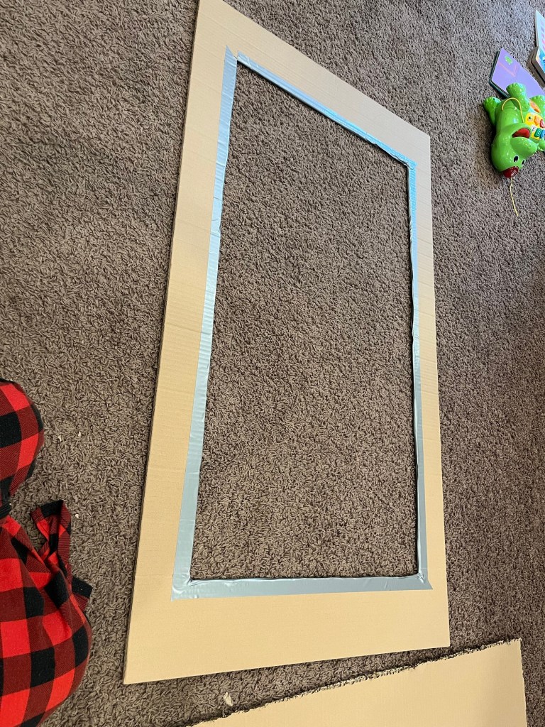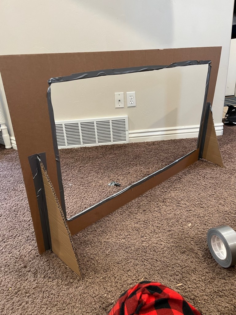I cut triangles of cardboard and taped them to the backside of the frame, making sure that I can move them side-to-side for easy storage later.